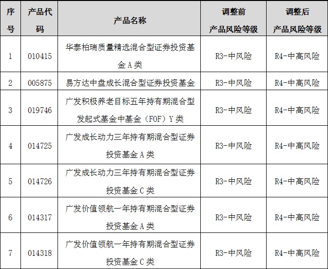 根据《证券期货投资者适当性管理办法》(证监会令第130号)、《基金募集机构投资者适当性管理实施指引(试行)》(中基协发〔2017〕4号)等规定要求,为切实履行适当性义务,保护投资者权益,我行遵循产品风险等级评定孰高原则,近期已调整部分代销公募基金产品风险等级。调整后客户风险承受能力评估等级可能存在与产品风险等级不匹配情况,请您及时关注。